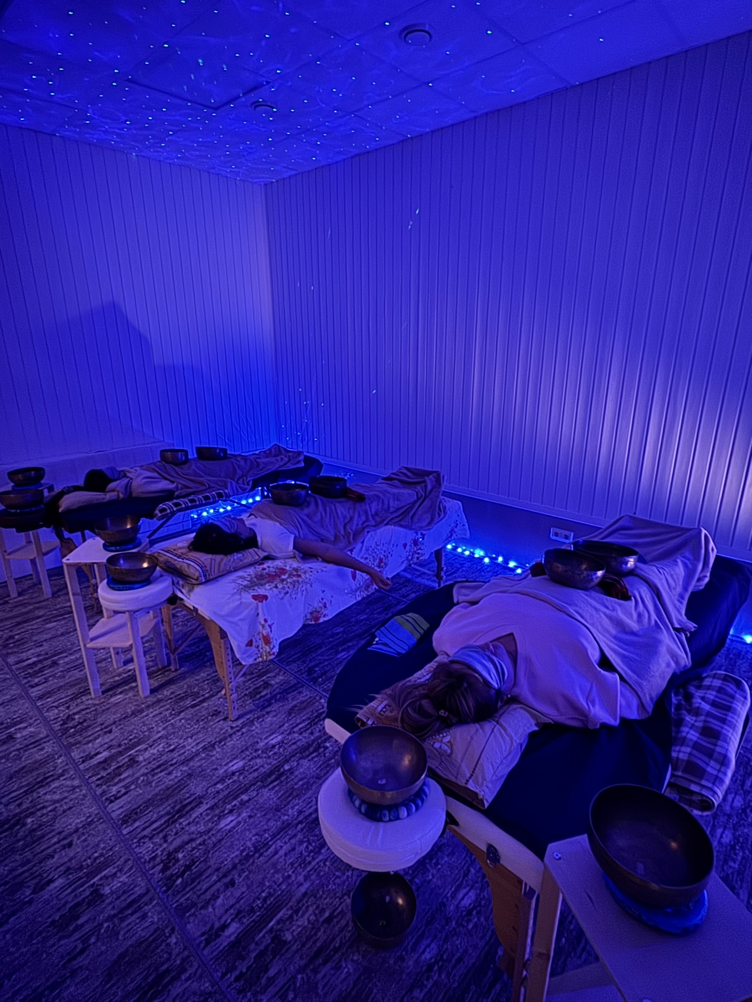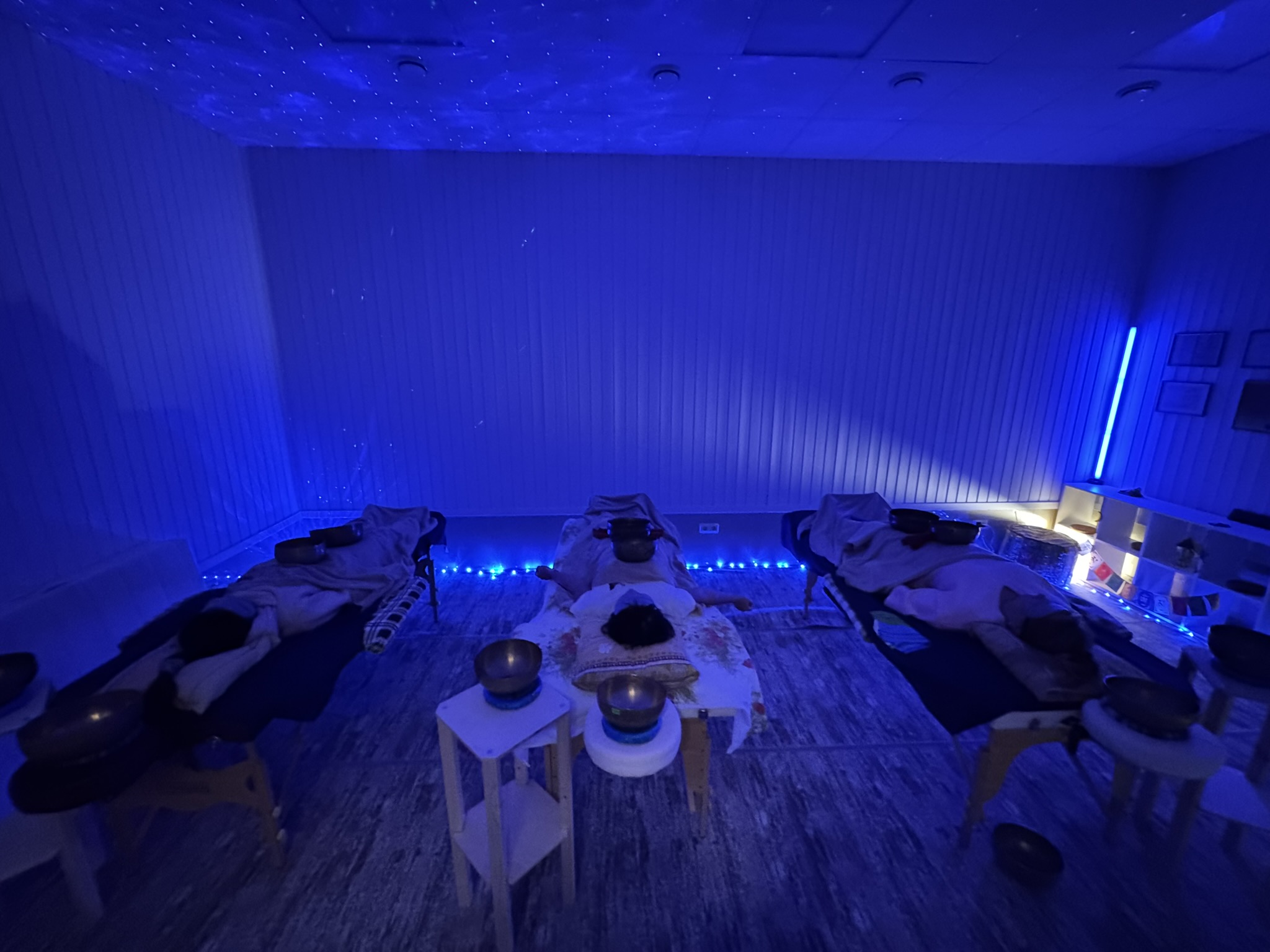 Выполняется индивидуально. Человек лежит на удобном массажном столе на животе. Я провожу чашей по вашей ауре, очищая ауру и знакомя вас с чашей. Касаюсь ступней каждой ноги, активируя каналы и точки на ногах. Человек чувствует мощный поток энергии. Далее провожу чашей по ногам, тазу, круговыми движениями вращая чашу, ударяя в нее стиком. Таким образом прохожу заднюю поверхность ног, таз. Далее работаю 2,3,4 чашами по телу. После чего вы переворачиваетесь на спину. Открываю каналы на больших пальцах ног, выполняя виброакустическое воздействие чашами по всему телу. Последние 10 минут вы лежите окруженные 13-ю чашами, они стоят на теле и вокруг вас, наполняя невероятными космическими звуками и вибрациями. После окончания массажа звучит мантра и идет обсуждение полученного опыта. Длительность 1 час