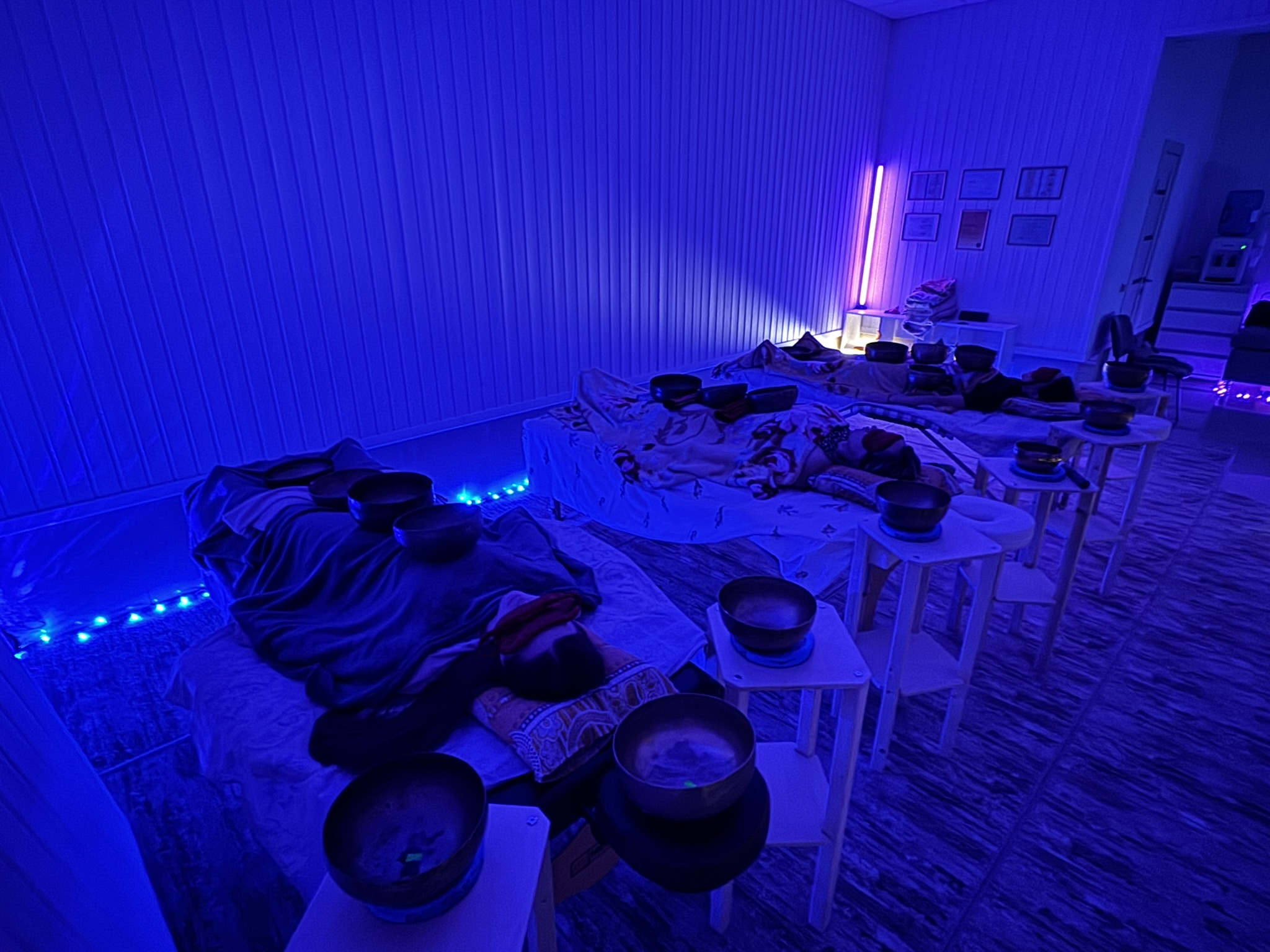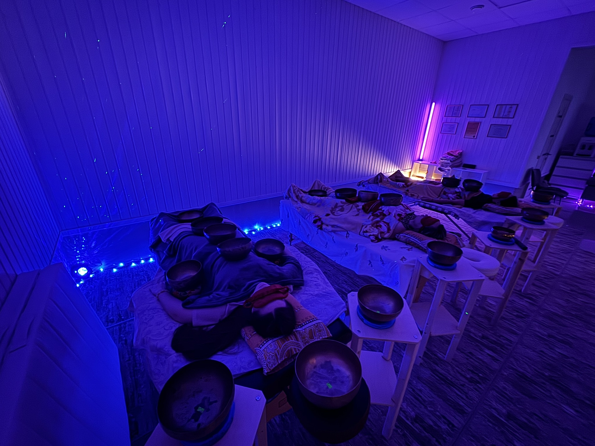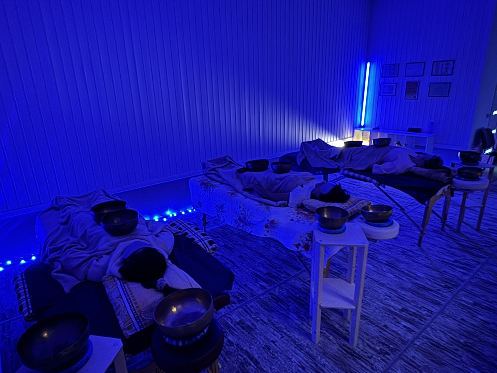Участники лежат полукругом, закрывают глаза. Чаши расставляются так, чтобы звук окружал вас со всех сторон.